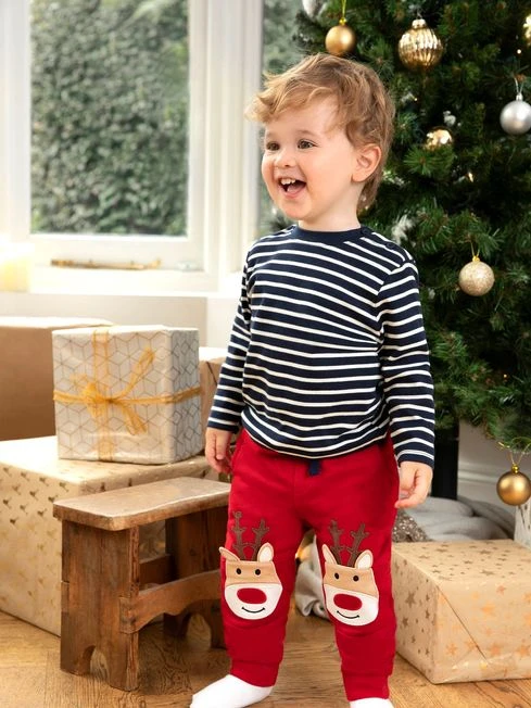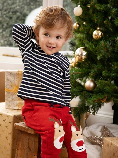 We’ve livened up a classic pair of red joggers with reindeer appliqués on the knees that cheeky children will be delighted by this festive season. Simply team with a T-shirt for relaxed days at home or fun days out in the run up to Christmas. The stretchy, drawstring waist ensures a comfy fit as your child grows. Featuring reindeer appliqués to knees, slip pockets to the side, contrast navy drawstring and elasticated waistband for stretch and comfort. Please note that appliqué stitching may vary.