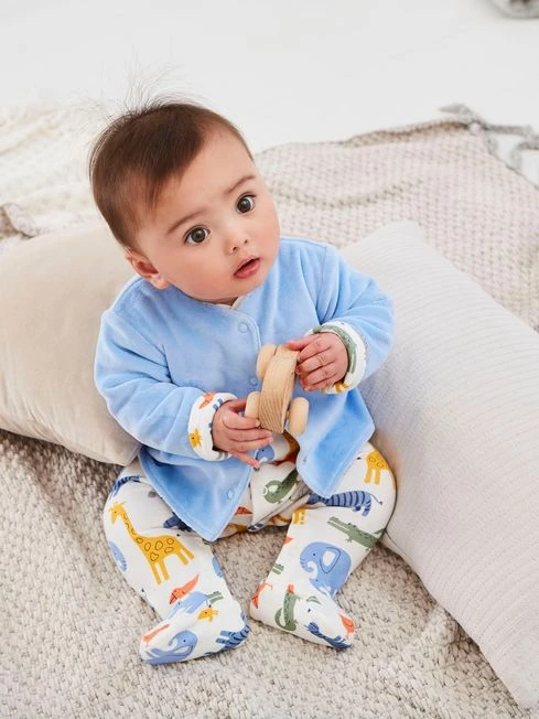 An adorable set for babies, the 2-piece safari baby jacket and sleepsuit set features a reversible, soft velour jacket to layer over the matching safari print sleepsuit for an extra cosy outfit on colder days. As always, our sleepsuit has been crafted from soft cotton and features built-in scratch cuffs in smaller sizes to ensure delicate skin is always protected, 2-piece set, reversible: one side soft velour in solid blue, one side safari print, popper front opening, popper front and leg openings for easy dressing, fold over scratch cuffs up to size 9-12 months and sizes 9-12 months and up feature anti-slip dots on feet. KEEP AWAY FROM FIRE.