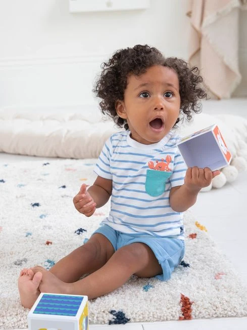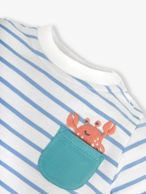 It’s easy to get your little one dressed with this adorable 2-Piece White & Blue Stripe Crab Pocket T-Shirt & Shorts Set. Featuring a striped t-shirt with a cute crab in the pocket, this set comes with coordinating shorts made from soft cotton that is gentle on delicate skin. 2-piece set. Includes shirt and shorts. All-over stripe to the t-shirt. Round neck. Short sleeves. Button shoulder opening for easy dressing. Soft stretch drawstring waist to shorts.