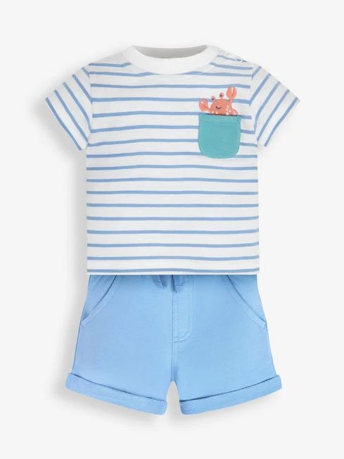 Jojo Maman Bebe Jojo Maman Bébé White 2-Piece & Blue Stripe Crab Pocket T-Shirt & Shorts Set