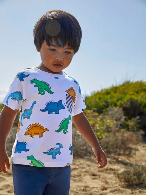 With updated versions of classic prints, your child’s wardrobe can be made more interesting while remaining versatile. With its all-over dinosaur print and contrast stripe pocket, the White Dino Print Pocket T-Shirt transforms a classic tee into something extra special. All-over dinosaur print Contrast stripe pocket to chest Round neck Short sleeves.