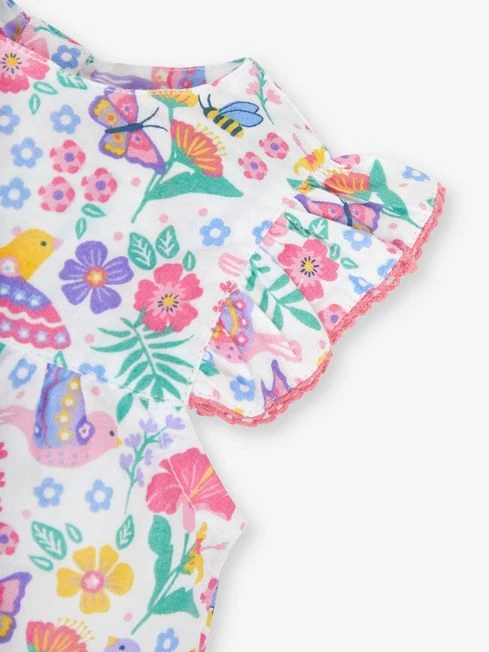 With all-in-ones, you can create an outfit with minimal effort and maximum style without any effort on your part. Our Floral Bird Print Pretty Sunsuit – adorned with cute birds and flowers – is perfect for summer and will keep your little one cool and comfortable all day long. All-in-one style. All-over bird print. Popper leg opening for easy changing. Back opening for easy dressing. Round neck. Ruffle sleeves.