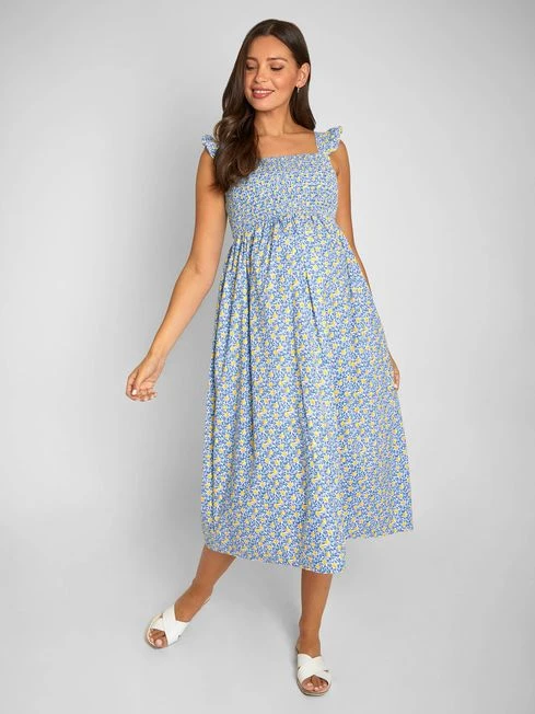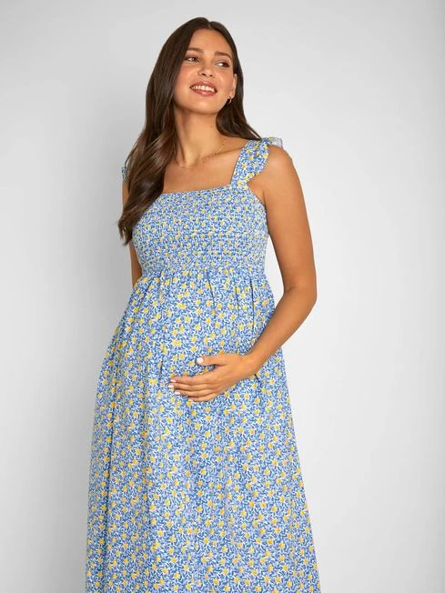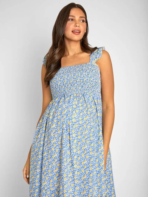 It’s hard to go wrong with shirred styles this summer because they are super flattering on any shape. In a palette of fresh blue, yellow and white, the Lemon Print Shirred Maternity Midi Dress is the perfect summer look. A ruffled sleeve adds a feminine touch, while the midi length makes it easy to dress up or down for any occasion. Designed to fit throughout pregnancy. All-over lemon print./ Shirring to chest. Sleeveless. Frill to straps. Square neck. Gathering to empire seam. Length 120cm.