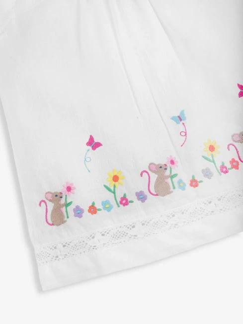 With our White Mouse Embroidered Blouse, you can create a simple yet stylish outfit. Featuring stunning mouse and floral embroidery in springtime colours, it features lace along the hem and neckline for extra flair. This garment is made from crisp white cotton, keeping skin cool and comfortable. • Mouse and floral embroidery to hem • Back opening for easy dressing • Short sleeves • Lace detail to chest, neckline and hem 95% Cotton, 5% Lyocell • Machine Wash At 40° • Use Delicate Setting • Wash Dark Colours Separately • Warm Iron On Reverse • Do Not Dry Clean