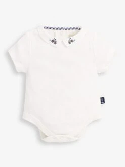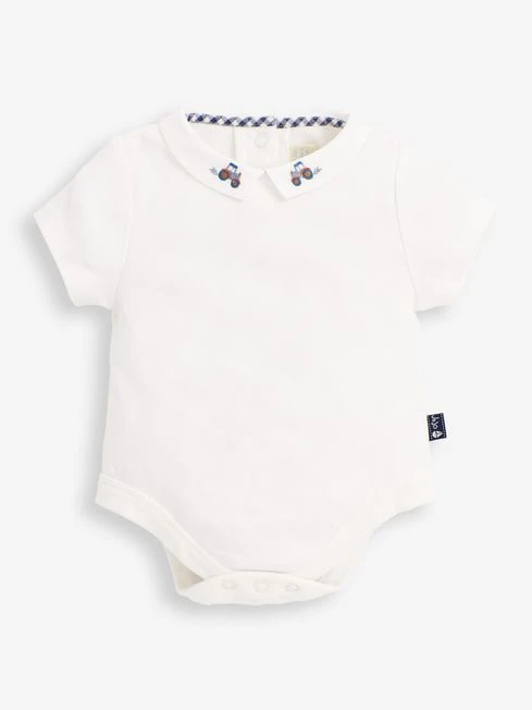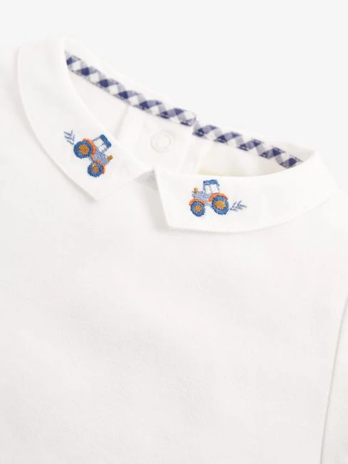 Their collar bodysuits are always a popular style, offering a smarter alternative to a regular top without coming untucked. The Tractor Embroidered Collar Baby bodysuit gives a nod to the great outdoors, featuring beautiful tractor embroidery on the collar for a sweet farm-themed look. Layer it under dungarees, or tuck it into leggings, shorts and trousers for little crawlers. Collar with tractor embroidery. Short sleeves. Popper back opening for easy dressing. Popper crotch opening for easy changing. Their bodysuits are cut looser than the type worn as underwear – designed as practical tops that stay tucked in, keep nappies covered and tights held up! 100% Cotton. Machine wash at 40°. Use delicate setting. Warm iron on reverse. Do not dry clean.