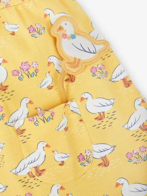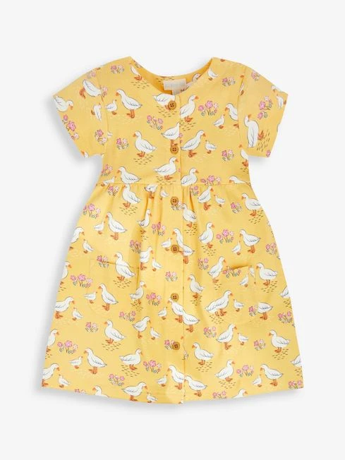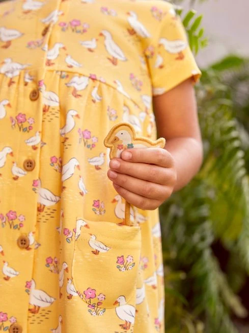 This Yellow Duck Print Button Through Dress is a modern take on a classic. The design features colourful ducks among sweet flowers in shades of yellow, orange, white and pink. The dress is crafted of soft cotton fabric and features a button front, short sleeves, and two handy pockets – plus there’s a little duck in the pocket! All-over duck print. A duck attached to a pocket. Round neck. Gathers at the waist for a full skirt effect. Short sleeves.