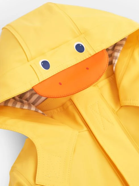 Our bestselling waterproof jacket gets a fabulous update this season. The new duck theme features a sweet duck face complete with eyes and beak, and coordinating pockets. The cheery lemon yellow tone is guaranteed to brighten up dreary days, and you’ll find lots of fantastic features including specialist breathable fabric to keep your child comfortable. Featuring cotton lined for cosiness and comfort, breathable bonded fabric, protects against wind and rain, waterproof, hood, zip closure with Velcro™ storm flap and pockets to the front. Please note that the breathability can occasionally mean a small, temporary distortion in the surface of the jacket when drying, returning to original condition once dry. 100% Polyester.
