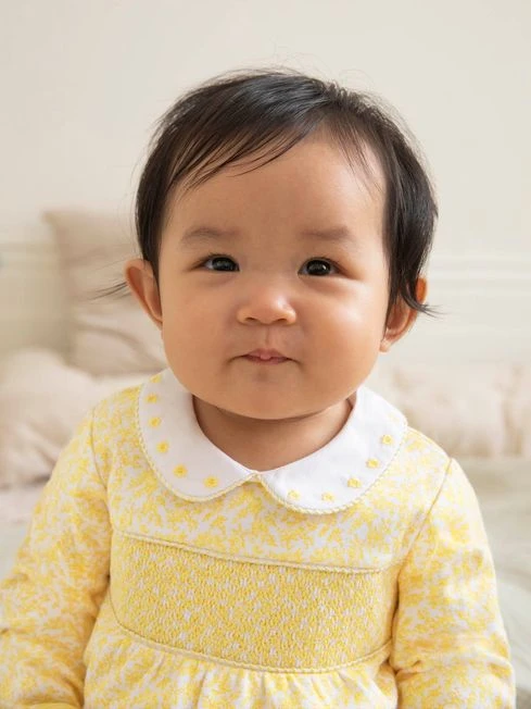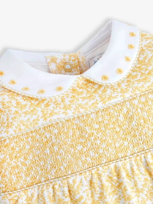 Smocked styles for girls are always popular, and our Yellow Pretty Smocked Sleepsuit version is even cuter. Traditional smocking lines the chest, and a Peter Pan collar with delicate floral embroidery makes it extra sweet. Featuring built-in scratch cuffs to ensure the most delicate skin is protected, our sleepsuits are made from the softest cotton. All-over floral print. Smocking detail to front. Flower embroidery on the collar. Popper back opening. Popper leg opening for easy changing. Fold over scratch cuffs up to size 9-12 months. Sizes 9-12 months and up feature anti-slip dots on feet. KEEP AWAY FROM FIRE.