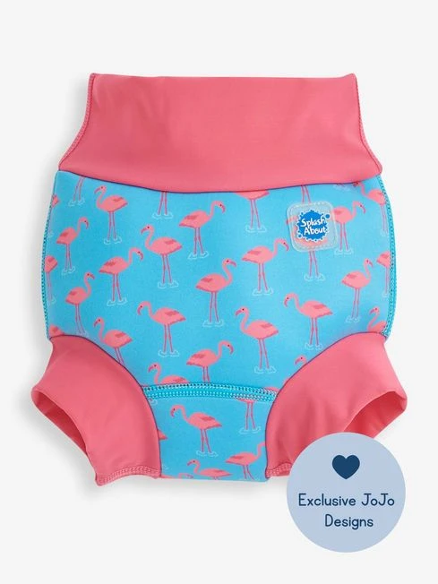The New and Improved Happy Nappy by Splash About is approved by swim schools, pool owners and leisure facilities globally to help protect other babies and swimmers from faecal accidents into the water. This season, we are excited to present this exclusive JoJo x Splash About collaboration which features original JoJo prints on the new Happy Nappy. This reusable swim nappy is made from super soft neoprene and is shaped into two back pieces, which cup your baby s bottom. These are held securely in place by a gusset, whilst specialist waist and leg fabric grips comfortably, yet snugly, to your child’s body. This ensures that no matter how they move and twist in the water there is no gaping. The front rib of the swim nappy is designed to roll gently down under the belly button to form a seal against the neoprene. Splash About have created this ergonomically form fitting nappy to be secure yet comfortable no matter how hard they play and kick in the water. Bestselling style, approved by many baby swim schools. Flamingo print exclusive to JoJo. Unique patented design for maximum protection against faecal leaks. Technology advanced for best fit and comfort. Ergonomic panel design moves as your child moves. Easy to pull on style. Snug fitting waist and leg holes.