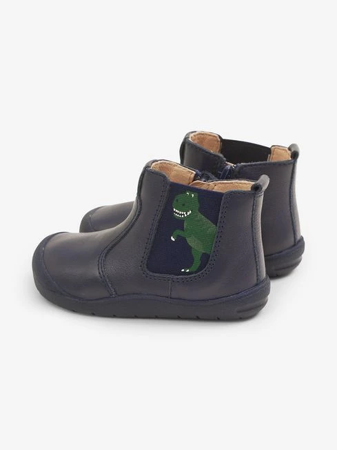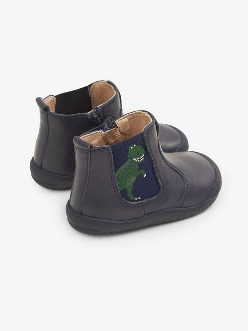 Roar with joy in these no-nonsense Navy T-Rex Leather Boots, designed to keep adventurous feet comfortable and protected whatever the weather. Part of a new Start-Rite x JoJo Maman Bebé collection, these shoes are made from soft leather to allow barefoot comfort for worry-free stomping around! With breathable leather linings and cushioned insoles for comfort, these lightweight boots feature a flexible sole for natural movement, along with heel and toe bumpers for extra protection in all the right places. Parents will be pleased to know there’s an inside zip fastening with an elastic side panel to help make getting these boots on and off a doddle for adults and children alike. Exclusive Start-Rite x JoJo Maman Bébé design. Ideal first walking boots. Zip fastening and flexible elastic panel to make taking boots on and off a breeze. Ultra flexible lightweight soles with just the right amount of grip for natural, easy movement. Leather linings to absorb moisture and help keep little feet dry and comfy. Super soft leather for instant comfort. Scuff resistant heel and toe bumpers for protection just where it’s needed Click here for the Complete Guide to our Start-Rite collection. We recommend the Start-Rite Measuring Gauge to ensure you find the right fit. Returns Start-Rite shoes purchased online can only be returned to a store which stocks the Start-Rite x JoJo collection.Click here to see the list of participating stores.They can also be returned via post to our warehouse. Upper & Lining: 100% Leather, Sole: Rubber.